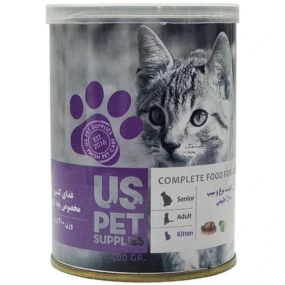 کنسرو بچه گربه یو اس پت طعم گوشت مرغ و سیب 400 گرم