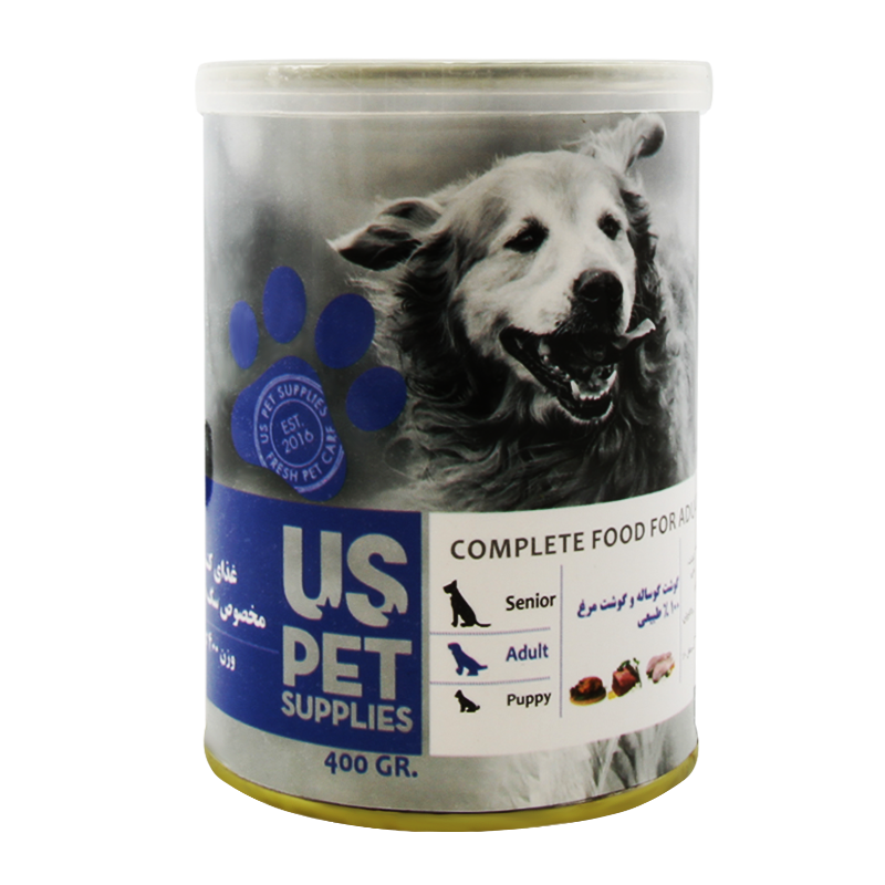 کنسرو غذای سگ یو اس پت با طعم گوشت گوساله و مرغ وزن 400 گرم